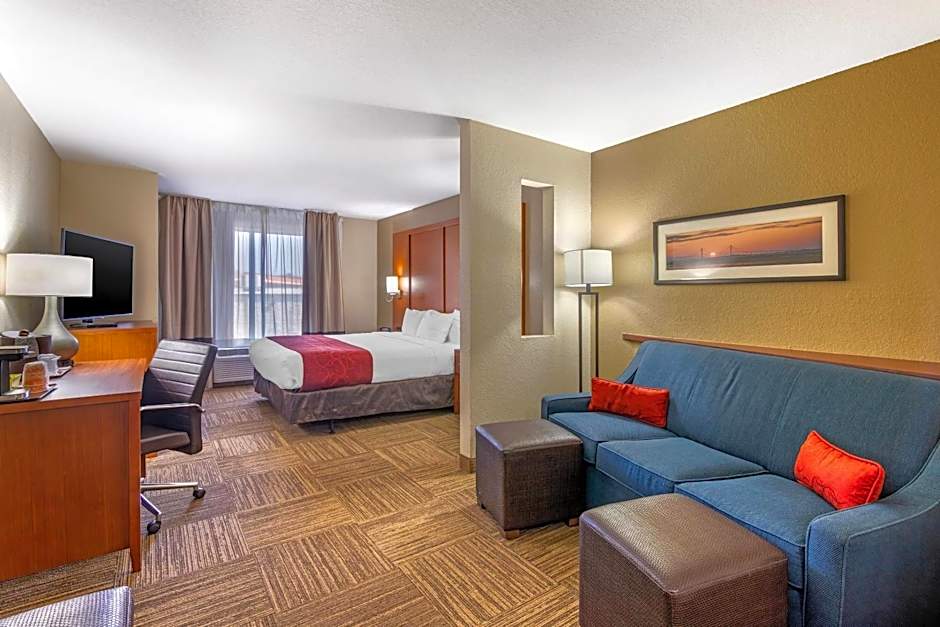 A small refrigerator, microwave, and coffee machine are offered in this suite.